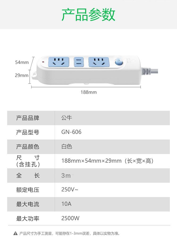 商品标题:公牛GN-606总控3位插排3米(单位:个)(新国标)