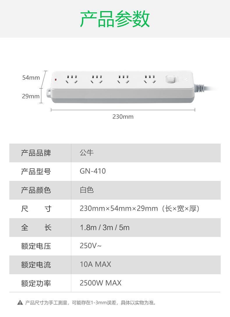 商品标题:公牛GN-410总控4位插排白色1.8米(单位:个)(新国标)
