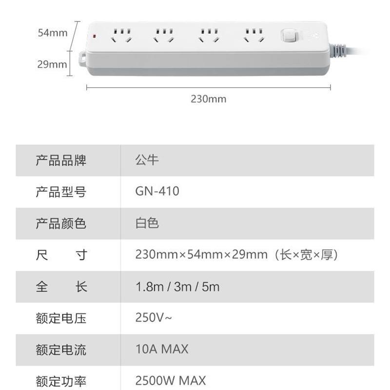 公牛GN-410总控4位插排白色1.8米(单位:个)(新国标)