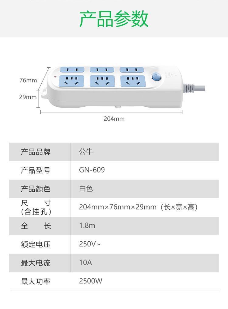 公牛GN-609总控6位插排1.8米(单位:个)(新国标)