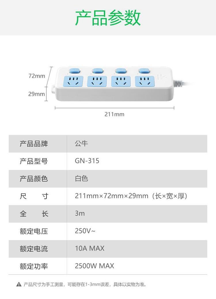 公牛GN-315分控4位插排3米(单位:个)(新国标)