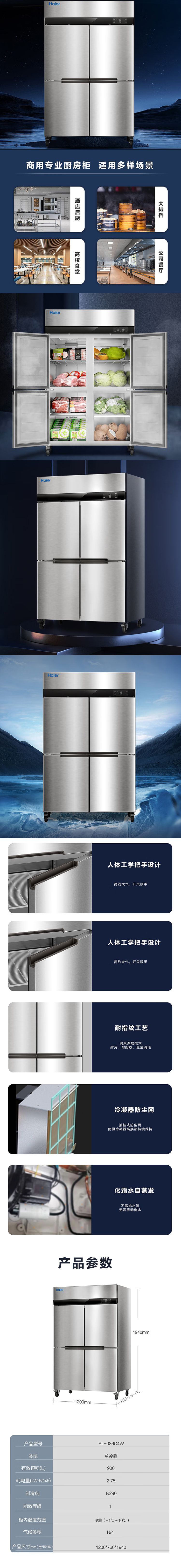 商品标题:海尔(Haier)商用厨房冰箱四门 风冷无霜全冷藏保鲜 不锈钢橱柜冷柜SL-986C4W(台)