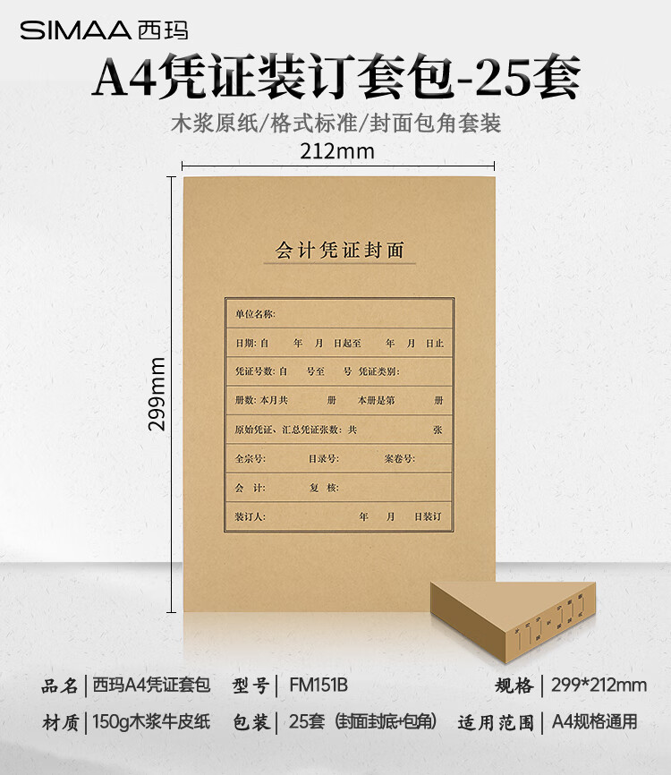 商品标题:西玛凭证封面A4竖版FM151B 封面+包角 25套/包212*299mm(包)