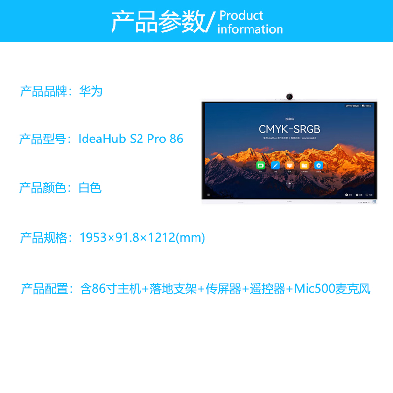 商品标题:华为IdeaHub S2 Pro 86寸会议平板一体机(含落地支架+传屏器+遥控器+Mic500扩展麦克风)(套)