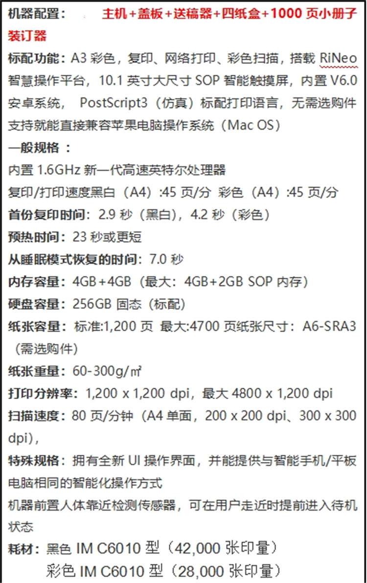 商品标题:理光IMC4510四纸盒 送稿器 1000页小册子装订器 彩色复合机(单位:台)