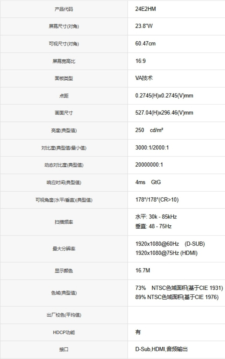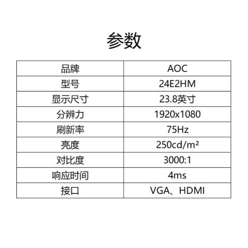 商品标题:AOC 24E2HM 23.8英寸 电脑显示器 (计价单位:台) 黑色