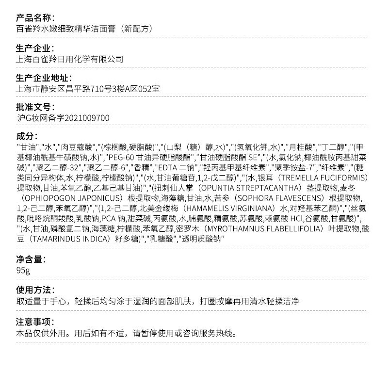 商品标题:百雀羚(PECHOIN)水嫩细致精华洁面膏95g(单位:瓶)