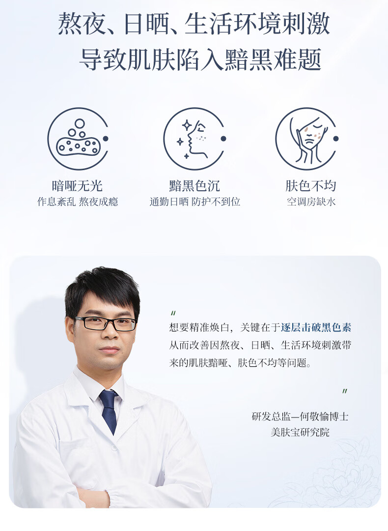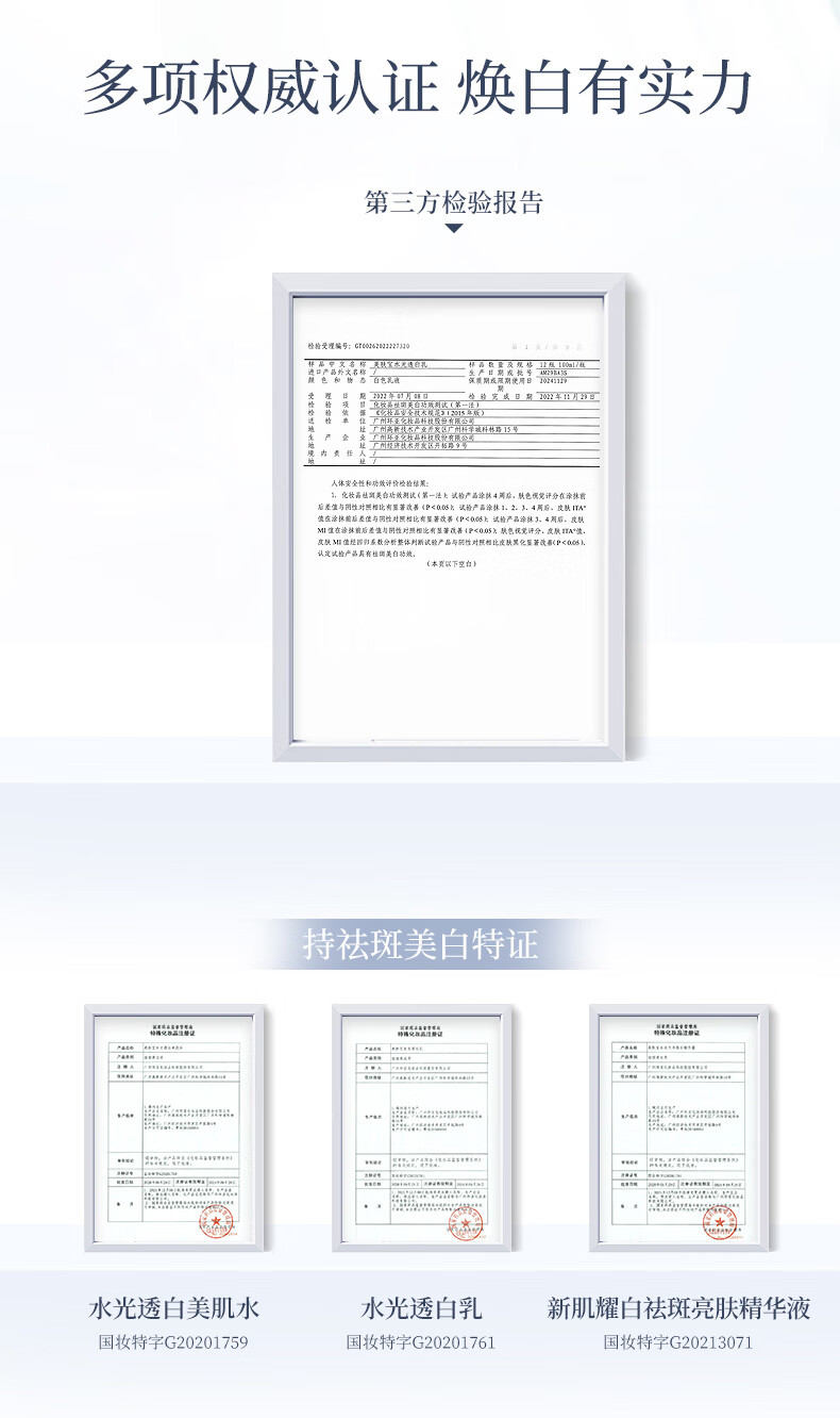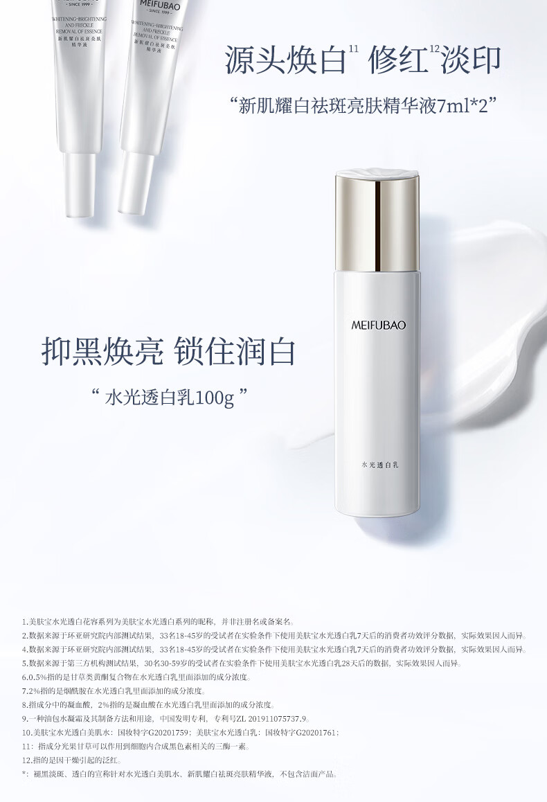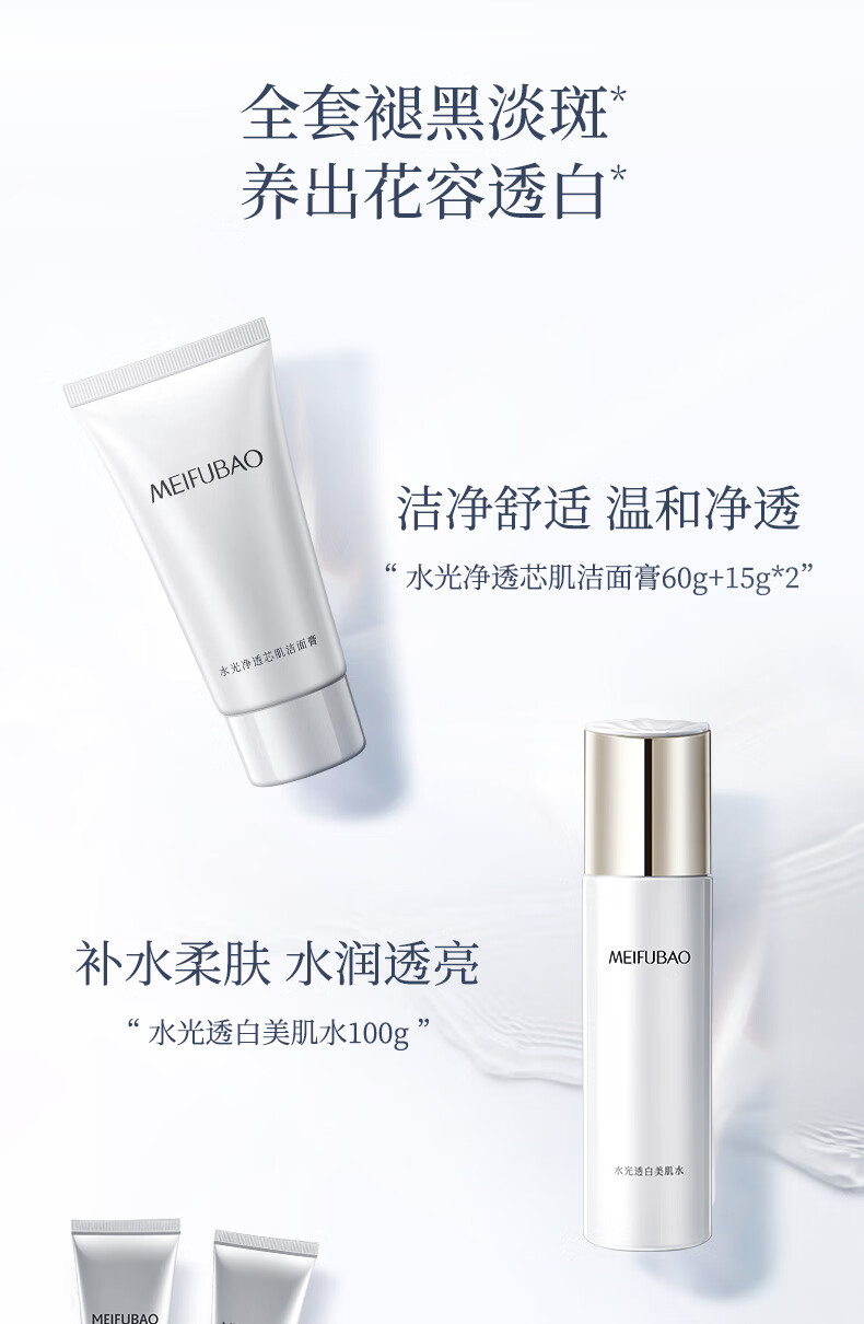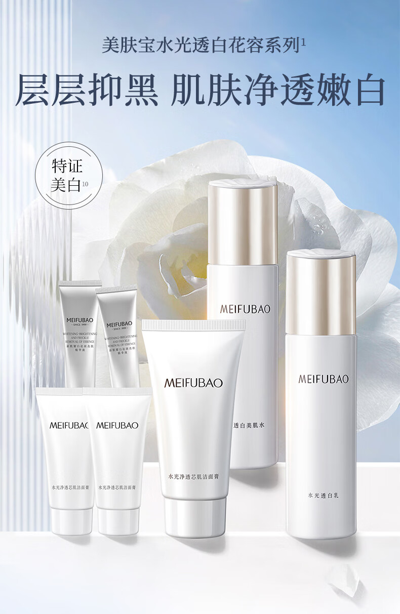 产品(注册/备案)名称:美肤宝水光净透芯肌洁面膏/美肤宝水光透白美肌水/美肤宝水光透白乳/美肤宝新肌耀白祛斑亮肤精华液