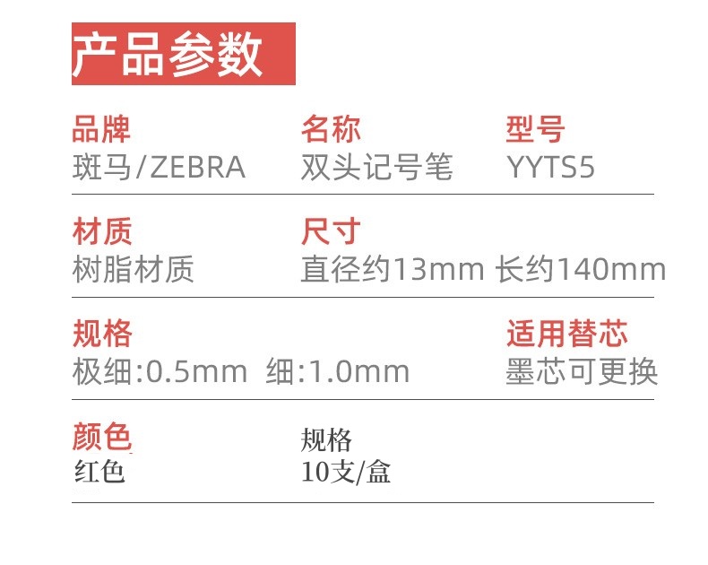商品标题:斑马YYTS5小双头油性记号笔10支/盒(盒)红色
