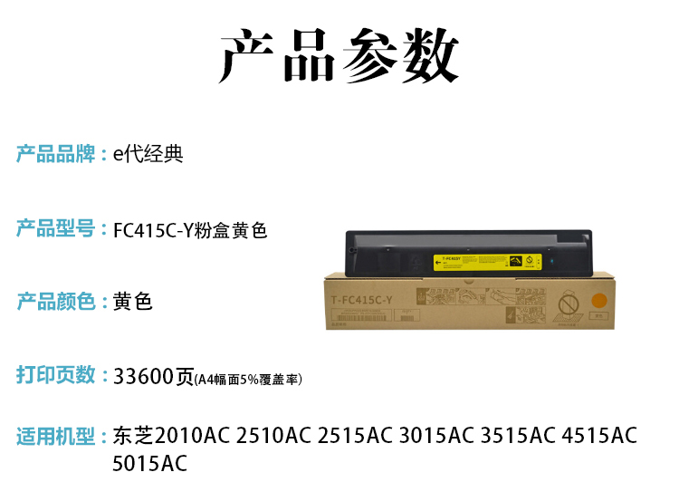 e代经典 FC415C-Y粉盒高容量(鼓粉分离)黄色单支装(适用东芝2010AC 2510AC 2515AC 3015AC 3515AC 4515AC 5015AC碳粉 )打印页数:33600页(单位:支)