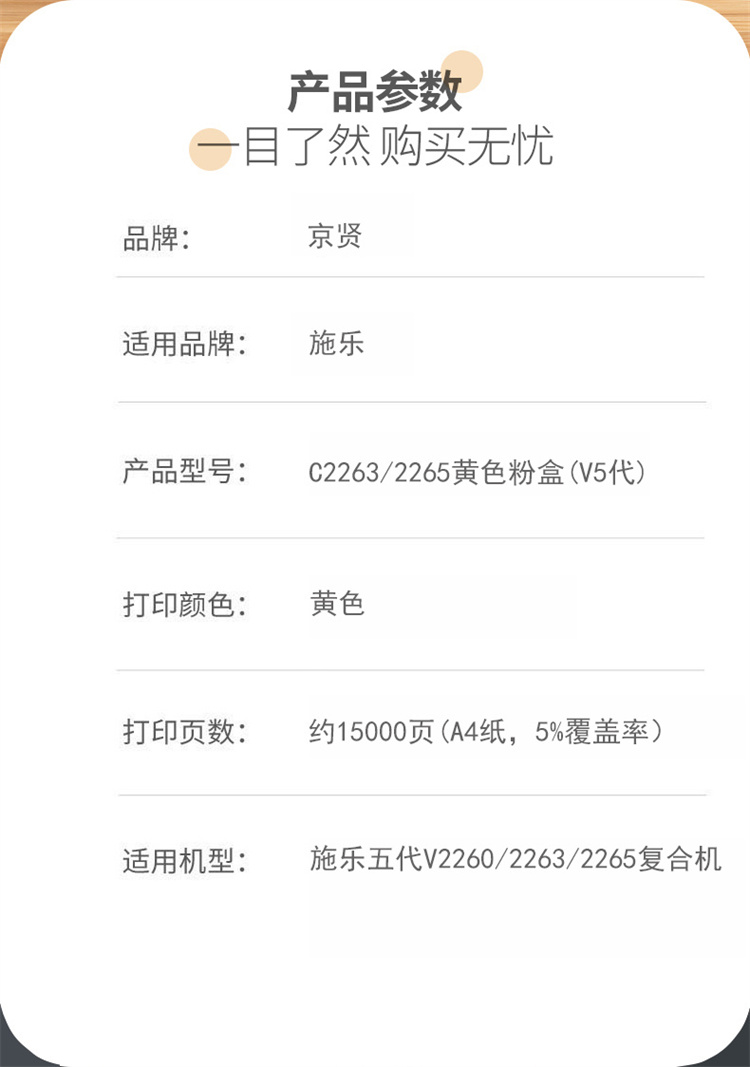 商品标题:京贤兼容C2263/2265(V5代)粉盒(鼓粉分离)黄色单只装(适用施乐 五代 V2260 2263 2265)打印页数:15000页(单位:只)