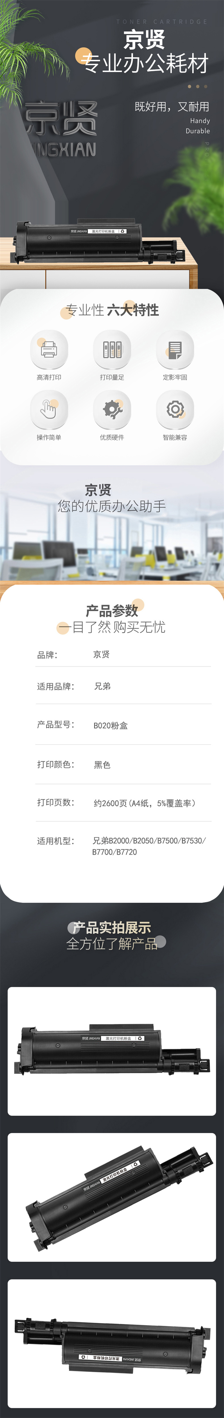 商品标题:京贤兼容B020粉盒(鼓粉分离)黑色单只装(适用兄弟 B2000/B2050/B7500/B7530/B7700/B7720)打印页数:2600页(单位:只)