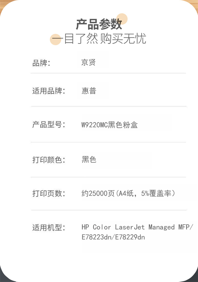 商品标题:京贤兼容W9220MC粉盒(鼓粉分离)黑色单只装(适用HP Color LaserJet Managed MFP E78223dn E78228dn)打印页数:25000页(单位:只)