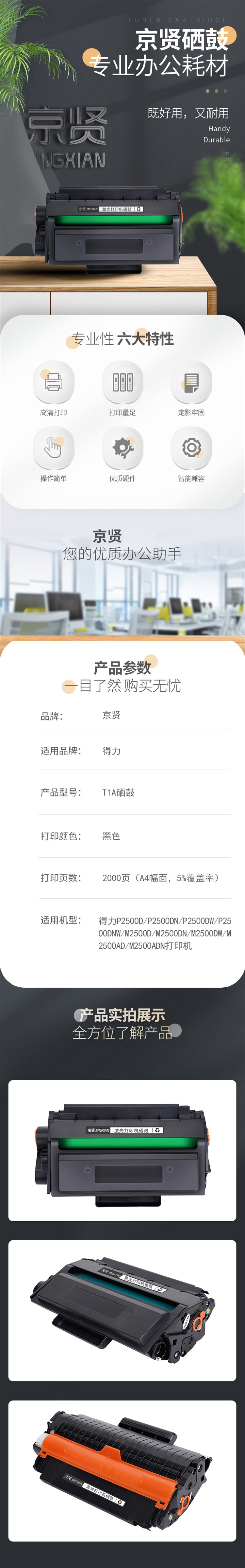 商品标题:京贤兼容T1A硒鼓(鼓粉一体)黑色单只装(适用得力P2500D/P2500DN/P2500DW/P2500DNW/M2500D)打印页数:2000页(单位:只)
