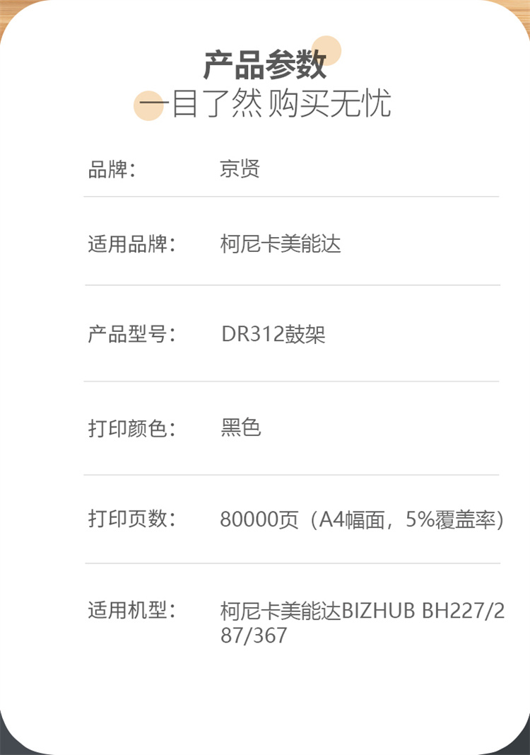 商品标题:京贤兼容DR312鼓架(鼓粉分离)黑色单只装(适用柯尼卡美能达BIZHUB BH227/287/367)打印页数:80000页(单位:只)