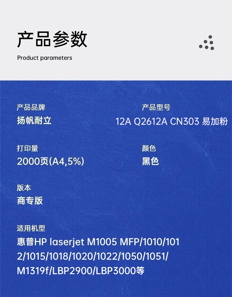 扬帆耐立兼容12A Q2612A CN303易加粉硒鼓(鼓粉一体)商专版黑色单支装(适用于惠普HP laserjet M1005 MFP/1010/1012/1015/1018/1020/1022/1050/1051)打印页数:2000页(单位:支)