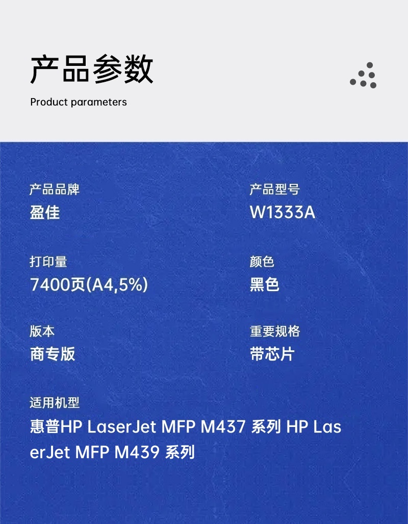 盈佳兼容W1333A粉盒(鼓粉分离)商专版带芯片黑色单支装(适用于惠普HP LaserJet MFP M437 系列 HP LaserJet MFP M439 系列)打印页数:7400页(单位:支)