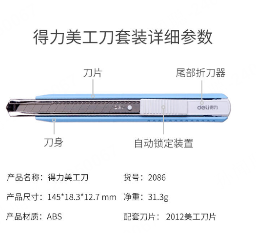 商品标题:得力2086美工刀145*18.3*12.7mm(白色)(单位:把)