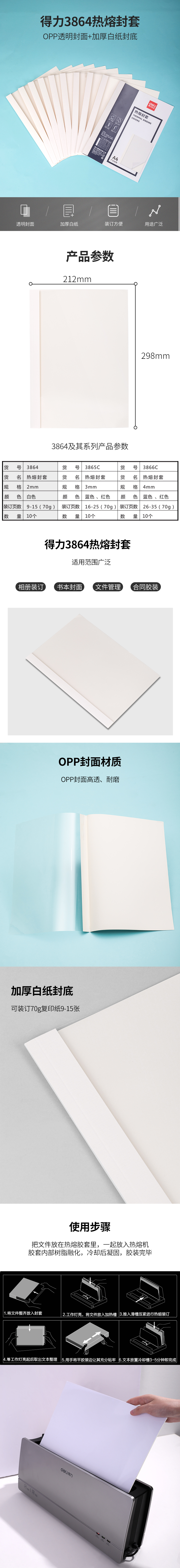 商品标题:得力3864热熔封套 白 A4/2mm 10PCS/袋(袋)