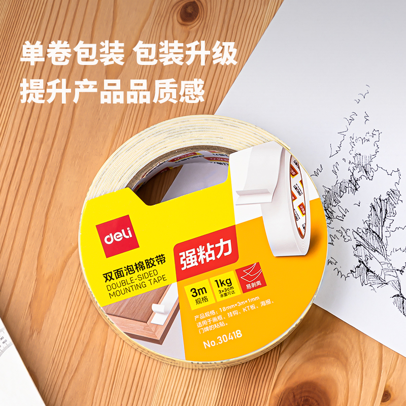 商品标题:得力 30418 油性双面泡棉胶带双面胶 18mmx3mx1mm (单位:卷) 白色