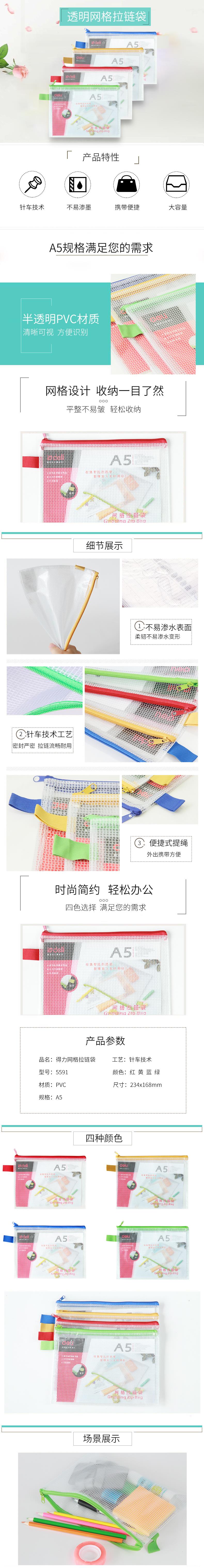 商品标题:得力 5591 A5网格拉链袋 (单位:只) 混色