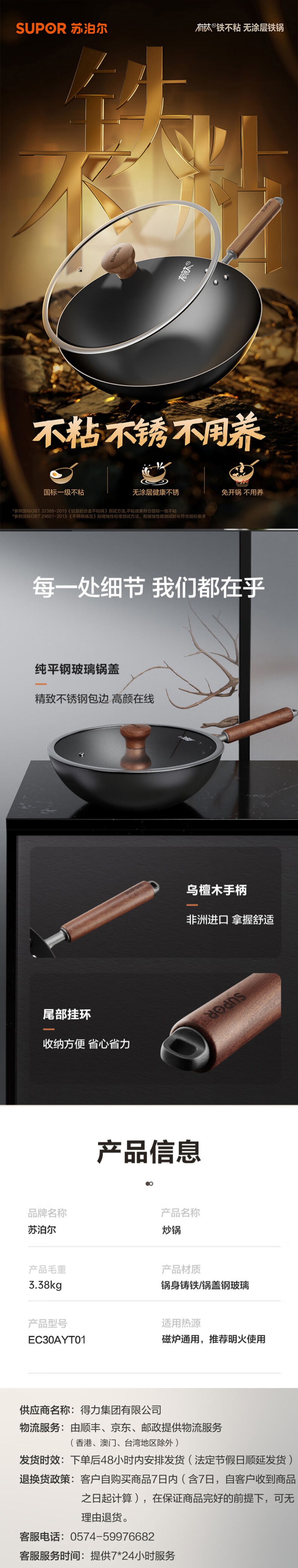 商品标题:苏泊尔EC30AYT01有钛铁锅无涂层家用炒锅不粘锅30cm(单位:口)