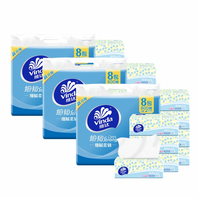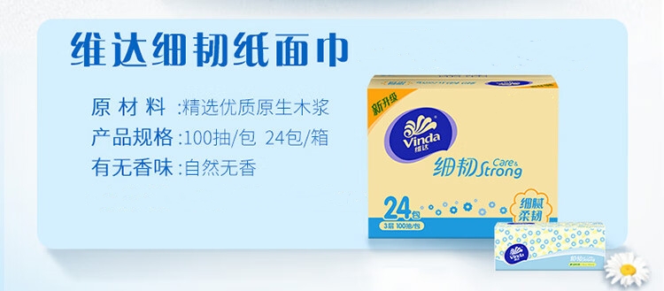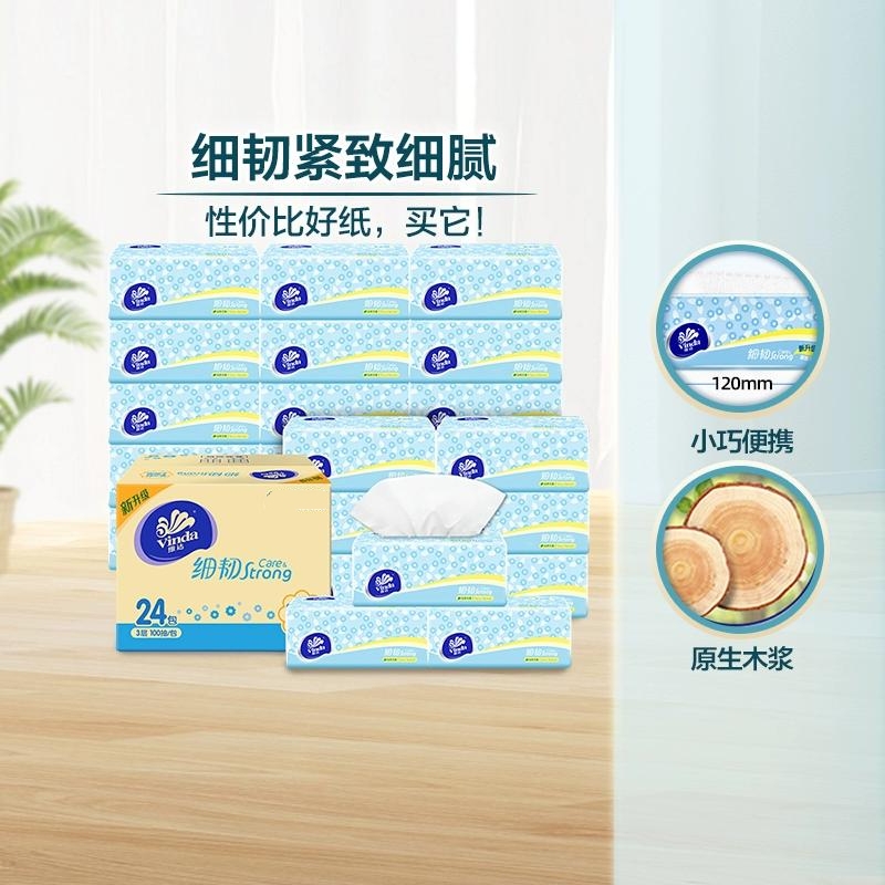 商品标题:维达 细韧抽纸3层100抽*24包(新旧提箱随机) VWXR24B3T 抽纸 100抽*24包 (单位:件)