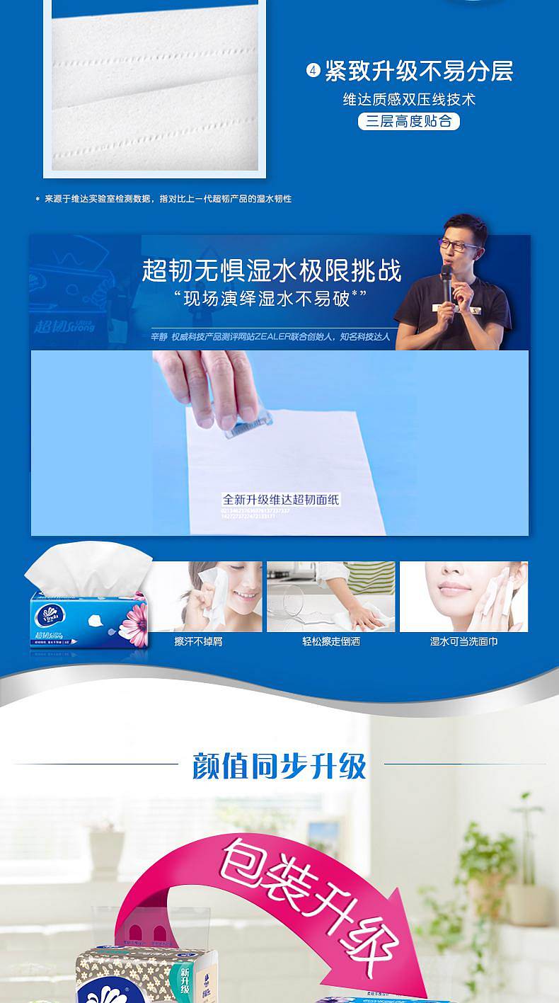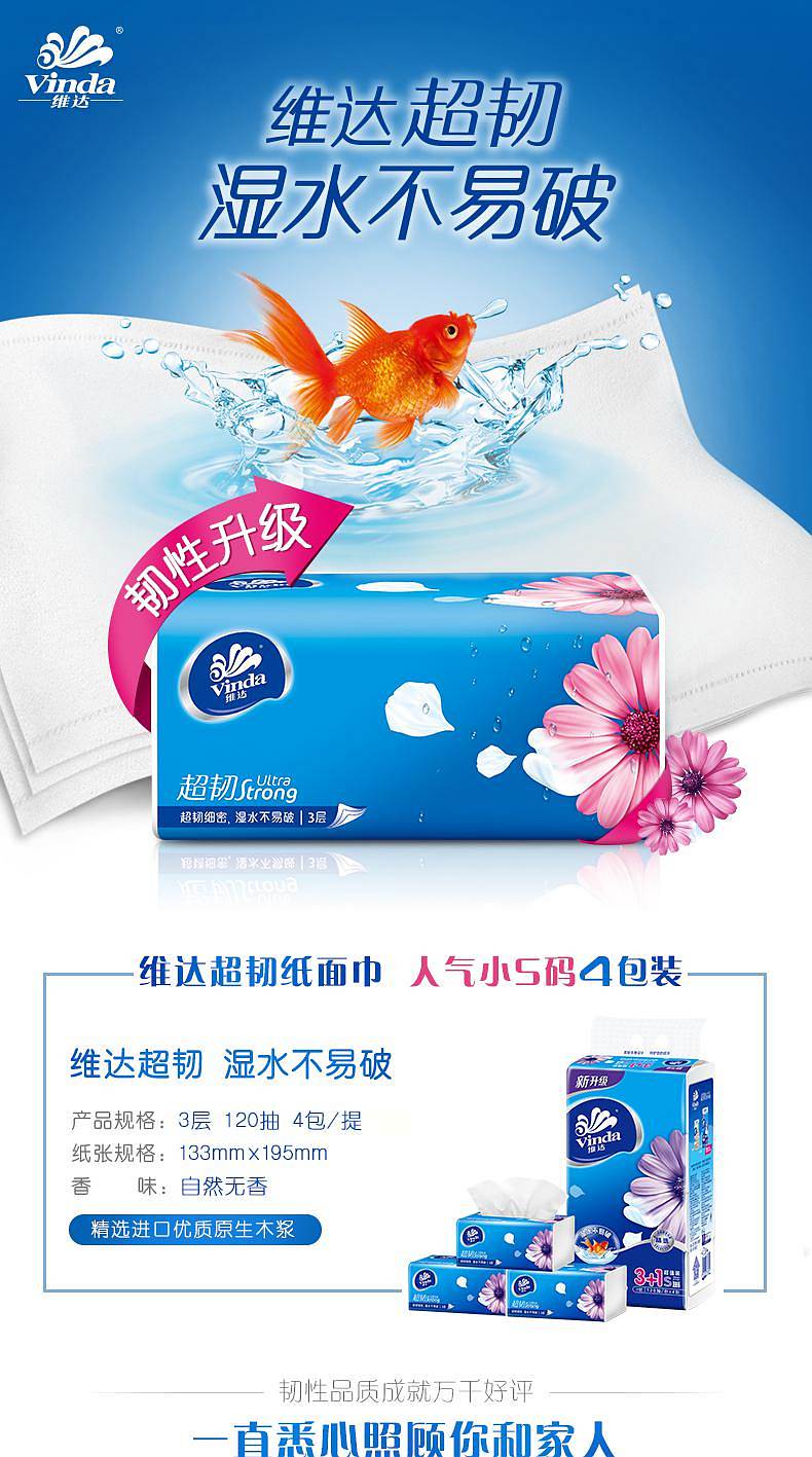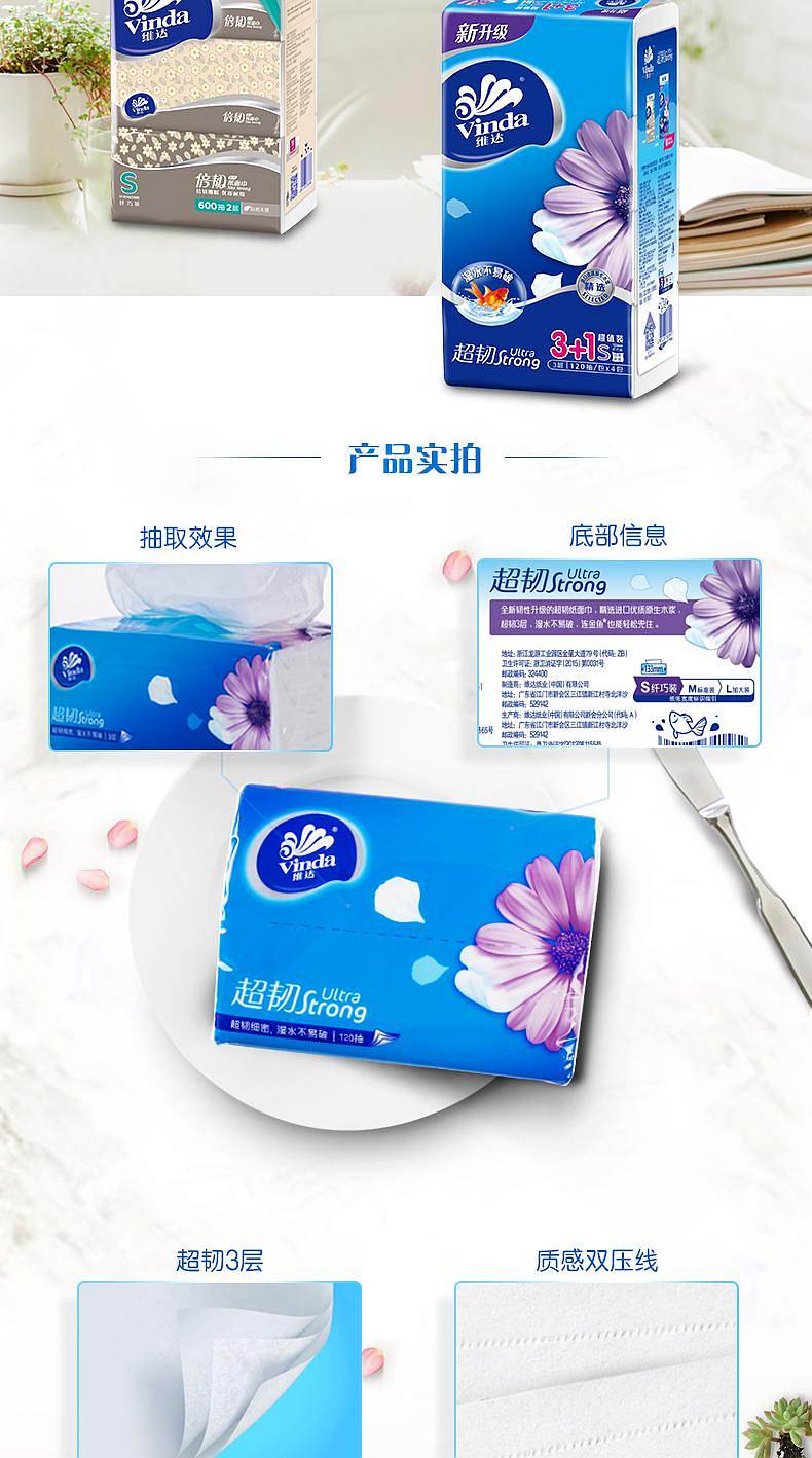 商品标题:维达(Vinda) V2223抽纸 超韧3层120抽软抽*4包(小规格)(提)