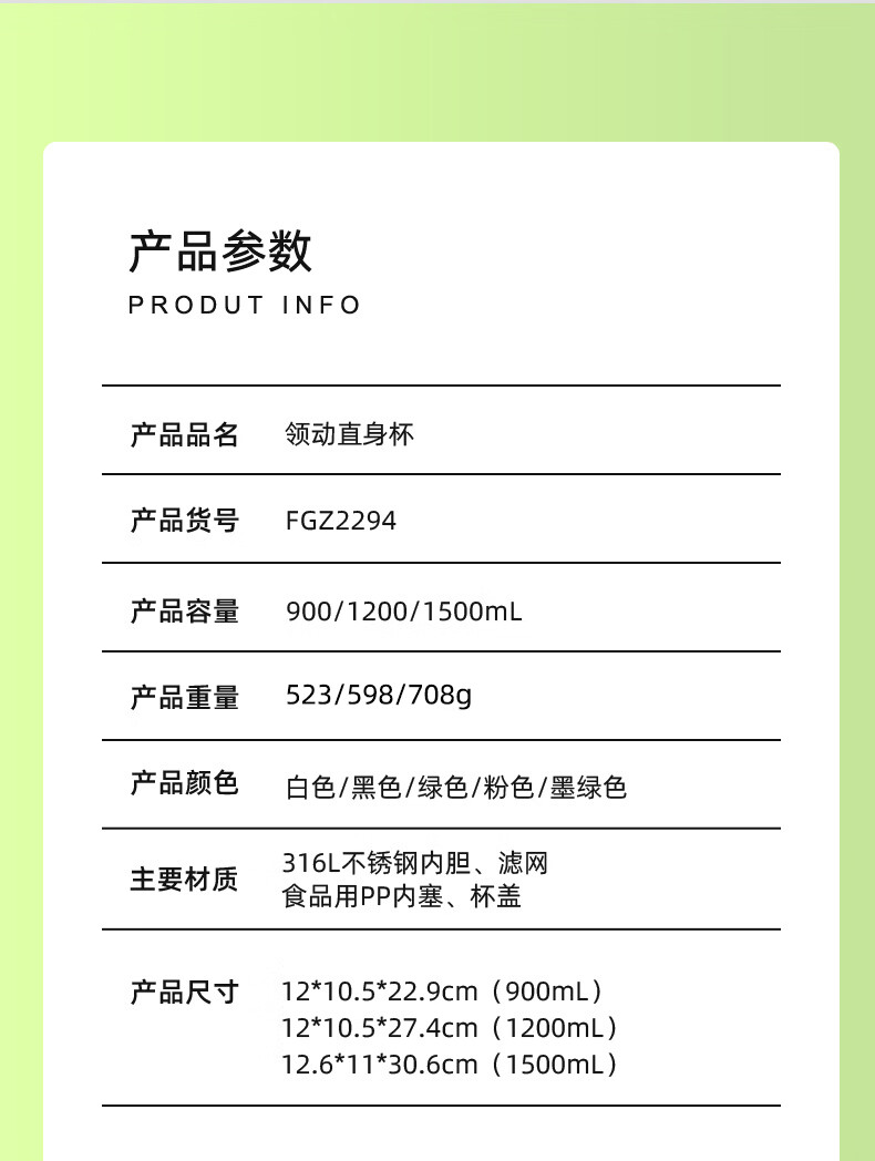 富光(FUGUANG)FGZ2294-1500领动直身真空杯1500ml(单位:个)(颜色随机)