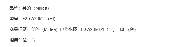 商品标题:美的(Midea)电热水器 F80-A20MD1(HI) 80L(台)