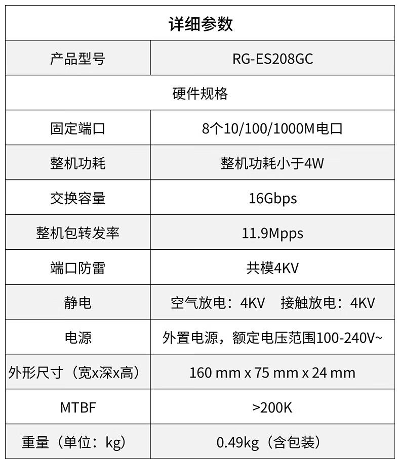商品标题:锐捷(Ruijie)RG-ES208GC 8口千兆办公监控工程交换机(台)