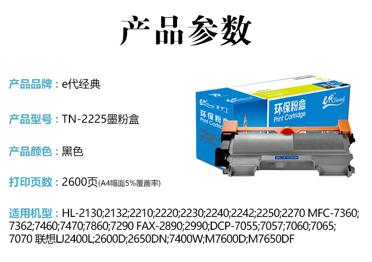 e代经典 TN-2225墨粉盒高容量 (鼓粉分离)黑色单支装(适用兄弟HL-DCP7060D DCP7065DN HL2230 HL2240 HL2240D 2250DN MFC7360 7470D )打印页数:2600页(单位:支)