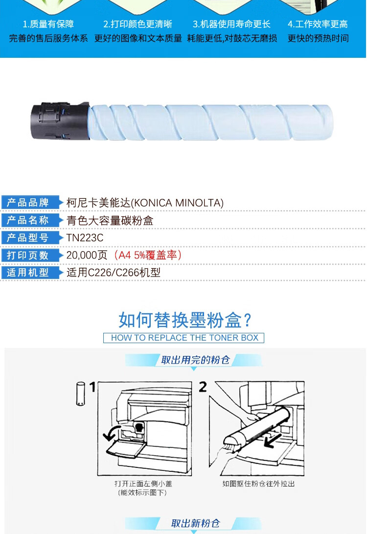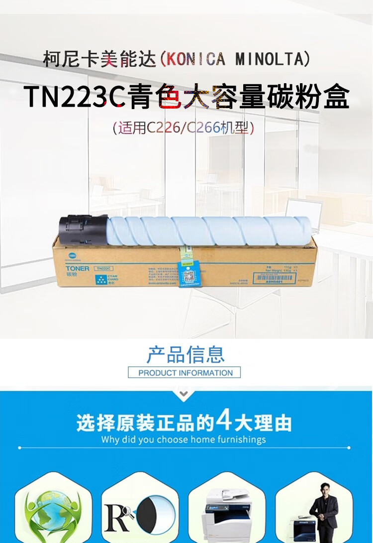 柯尼卡美能达TN223C大容原装碳粉(鼓粉分离)蓝色单支装(个)TNP32M(适用C226/C266) 打印页数:20000墨粉重量:107g