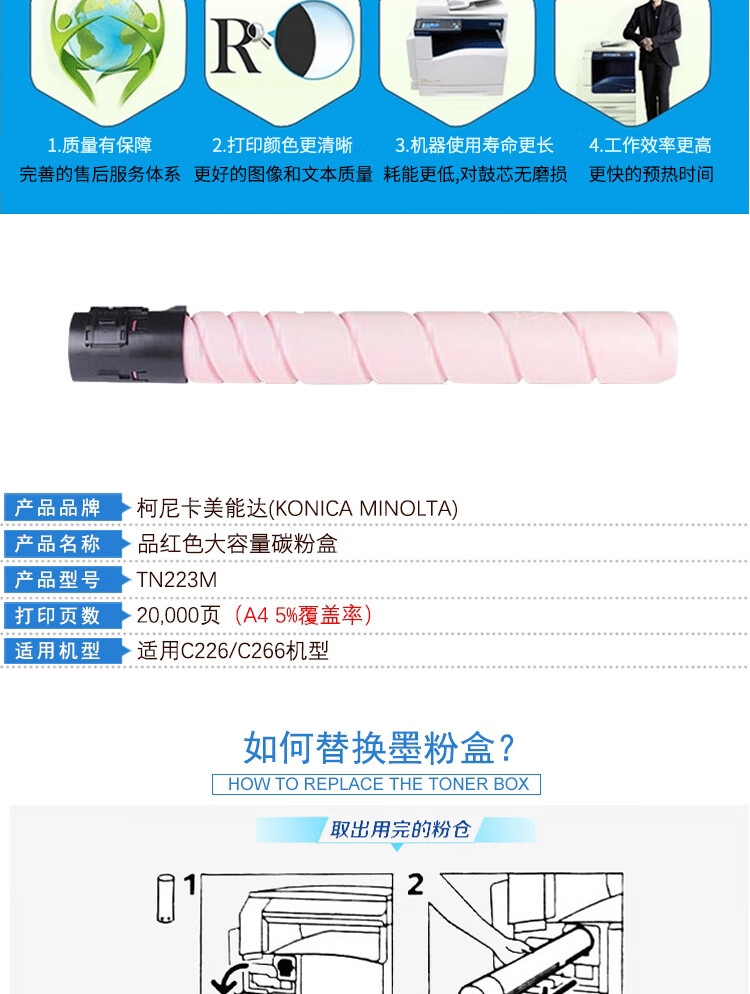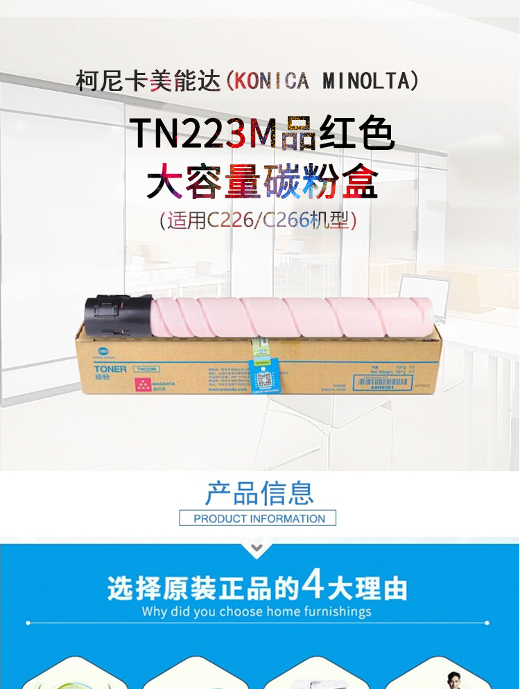 柯尼卡美能达TN223M大容原装碳粉(鼓粉分离)红色单支装(个)(适用C226/C266)打印页数:20000墨粉重量:115g