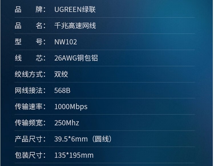 商品标题:绿联(UGREEN)NW102 3米六类非屏蔽网线 (20161)(计价单位:根)