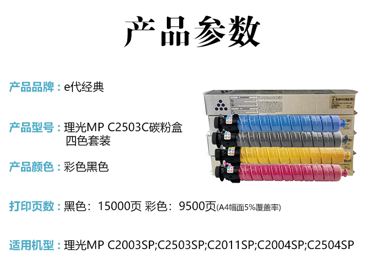 e代经典 MP C2503C碳粉盒(鼓粉分离)黑蓝黄红四色套装(适用理光MP C2003SP;C2503SP;C2011SP;C2004SP;C2504SP) 打印页数:黑色:15000页 彩色:9500页(单位:套)