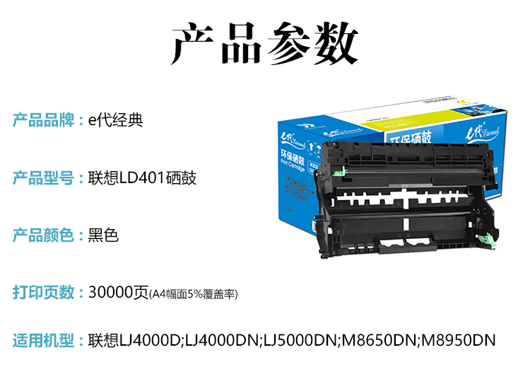 商品标题:e代经典 LD401硒鼓(鼓粉分离)黑色单支装 (适用联想LJ4000D LJ4000DN LJ5000DN M8650DN M8950DN打印机 )打印页数:30000页(单位:支)