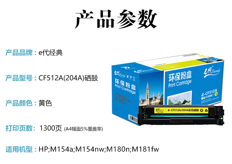 e代经典 HPCF512A(204A)硒鼓(鼓粉一体)黄色单支装 (适用于惠普HP M154/M180/M181打印机) 打印页数:1300页(单位:支)