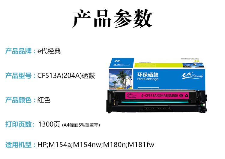 e代经典HPCF513A(204A)硒鼓(鼓粉一体)红色单支装(适用HP;M154a;M154nw;M180n;M181fw)打印页数:1300页(单位:支)