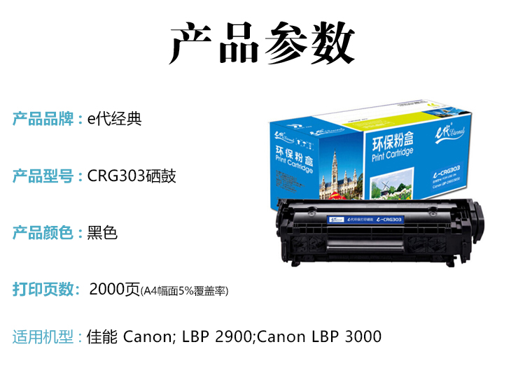 商品标题:e代经典 CRG303硒鼓(鼓粉一体)黑色单支装 (适用佳能LBP-2900 3000 惠普HP1012 1015 1020 M1005MFP/303) 打印页数2000页(单位:支)