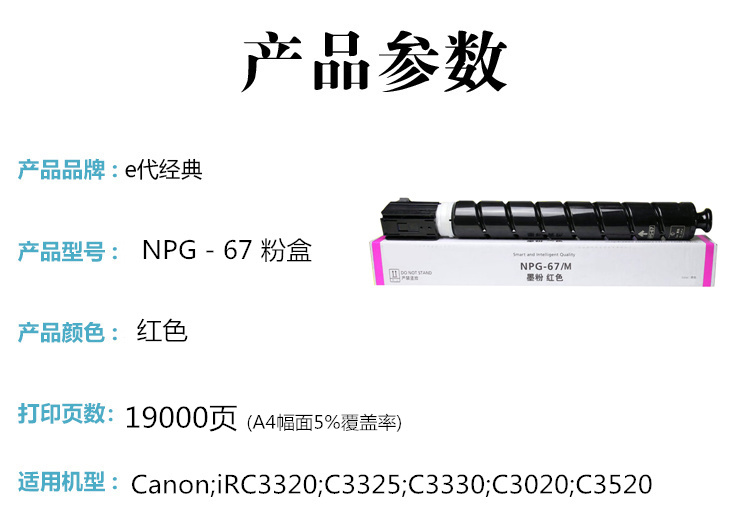 名称:e代经典NPG-67大容量佳能粉盒(不含鼓组件)红(单位:支) (适用:佳能Canon;iRC3320;C3325;C3330;C3020;C3520)