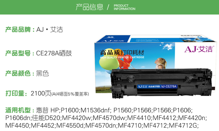 艾洁 CE278A硒鼓(鼓粉一体)黑色单支装 (适用惠普HP 78A P1560 P1566 P1600 P1606DN M1530 M1536dnf 佳能CRG-328 MF4452 4410 )打印页数:2100页(单位:支)