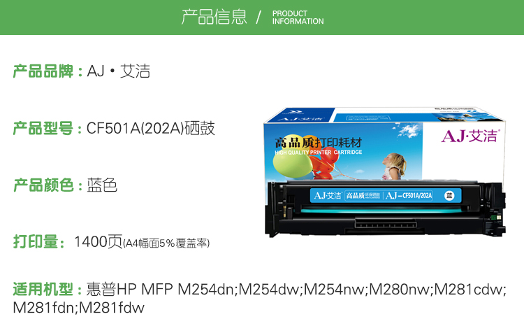 商品标题:艾洁 CF501A(202A)硒鼓(鼓粉一体)蓝色单支装( 适用惠普HP M254NW/DW/280N/281fdw 打印机) 打印页数:1400页(单位:支)