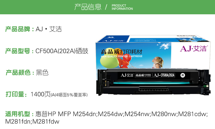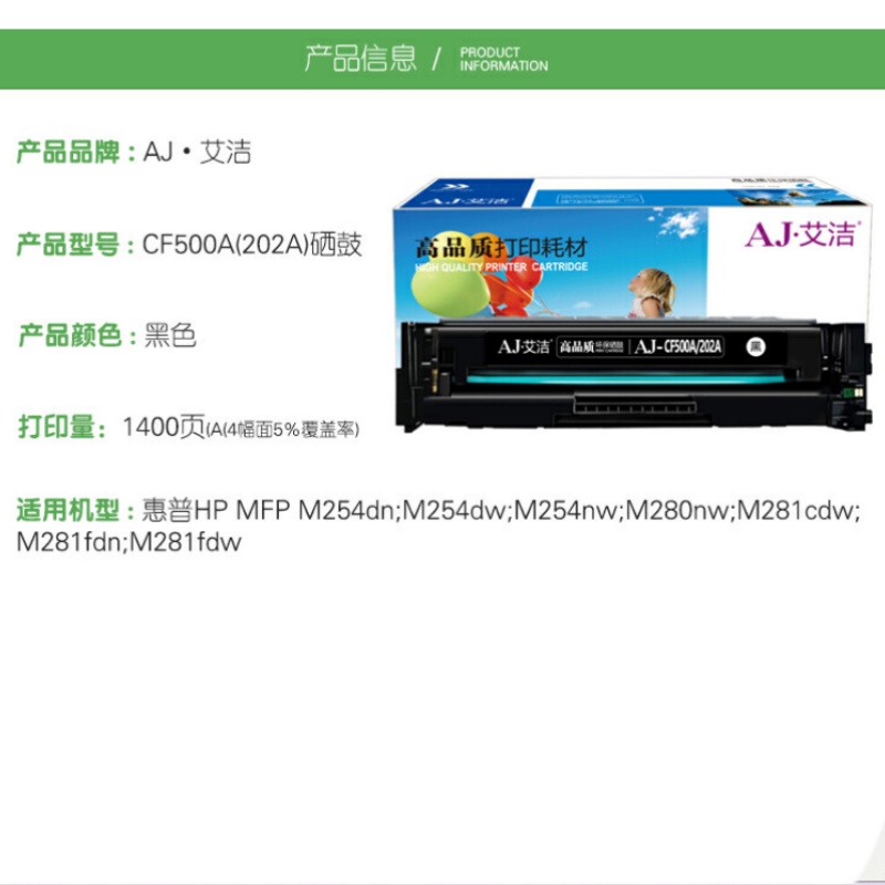 商品标题:艾洁 CF500A(202A)硒鼓(鼓粉一体)黑色单支装( 适用惠普HP M254NW DW 280N 281fdw 打印机) 打印页数:1400页(单位:支)