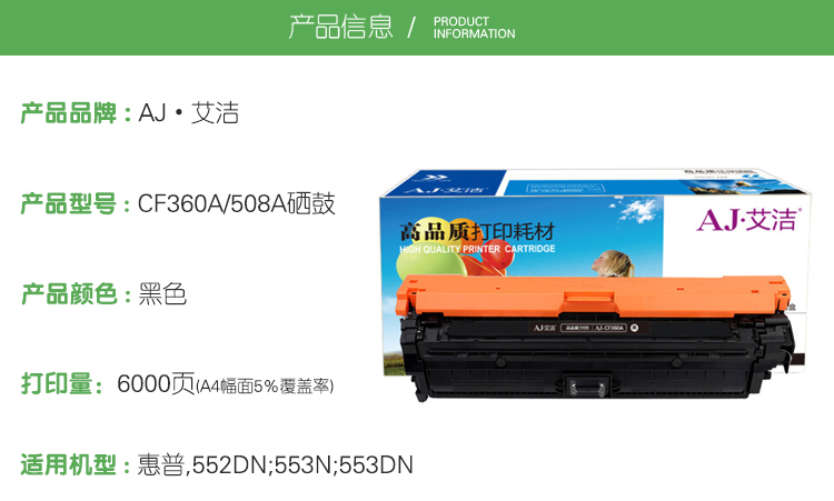 艾洁 CF360A 508A硒鼓(鼓粉一体)黑色单支装 (适用惠普M553dn M577dn M576 M553N 508A M552dn )打印页数:6000页(单位:支)