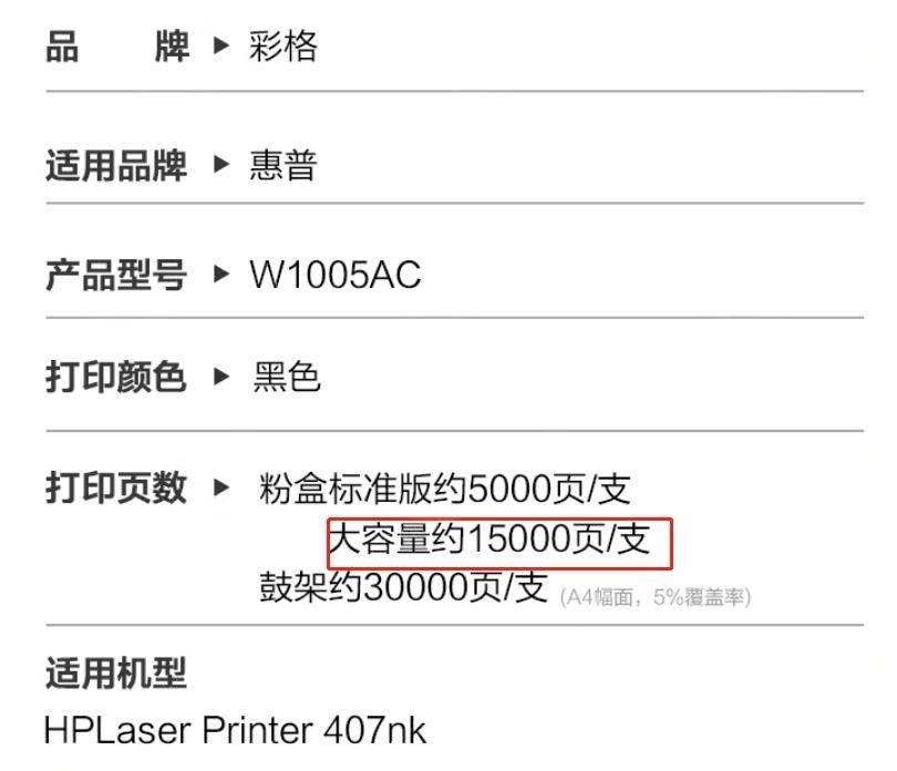 商品标题:彩格 W1005AC 大容量版粉盒-带芯片 打印量15000页 适用惠普hp laser printer407nk 墨粉盒 黑色 (计价单位:支)