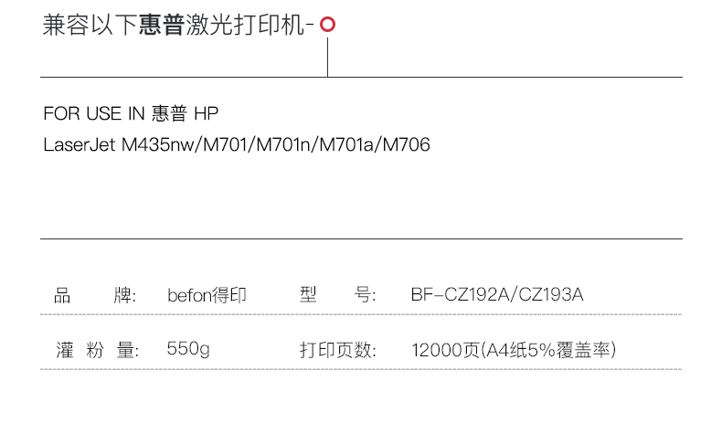 得印(befon)PLUS兼容BF-CZ192A硒鼓黑色单支装(适用惠普HP M435nw、M701、M701a、M701n、M706n、M706dn、M706dtn打印机)打印页数:12000页(单位:支)