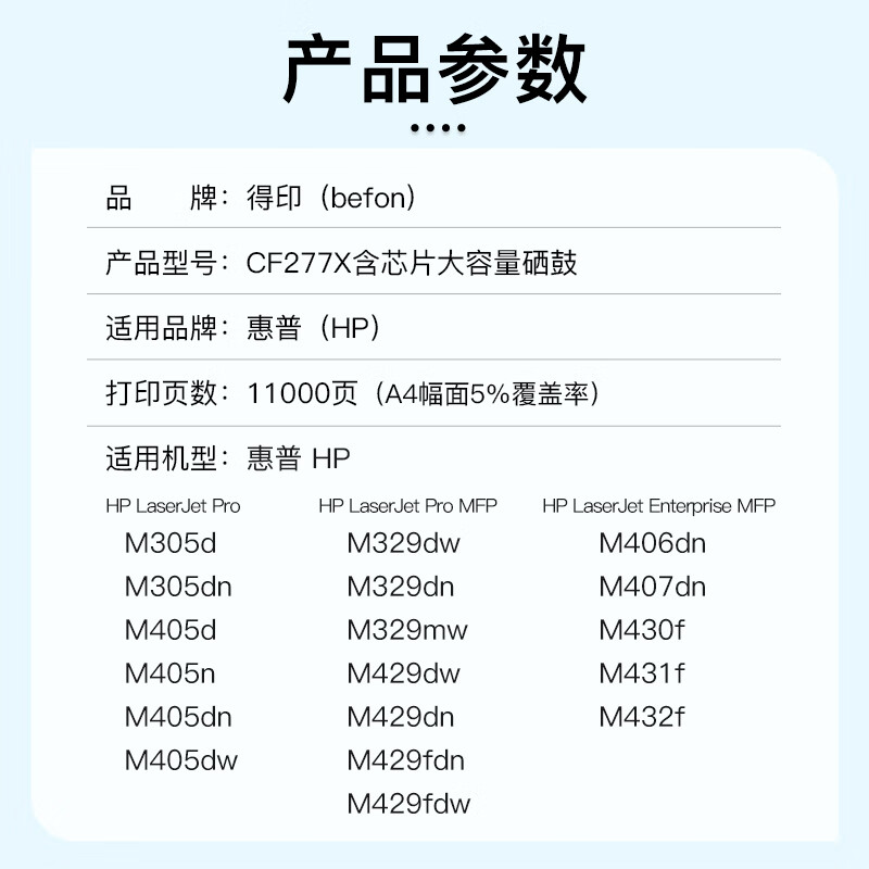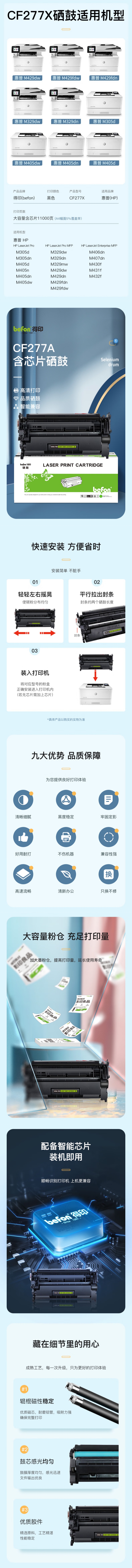 商品标题:得印(befon)CF277X硒鼓(鼓粉一体)黑色单支装(适用惠普405d m329dw硒鼓m429dw m405dw/dn m305dn/430dw) 打印量:11000页(单位:支)