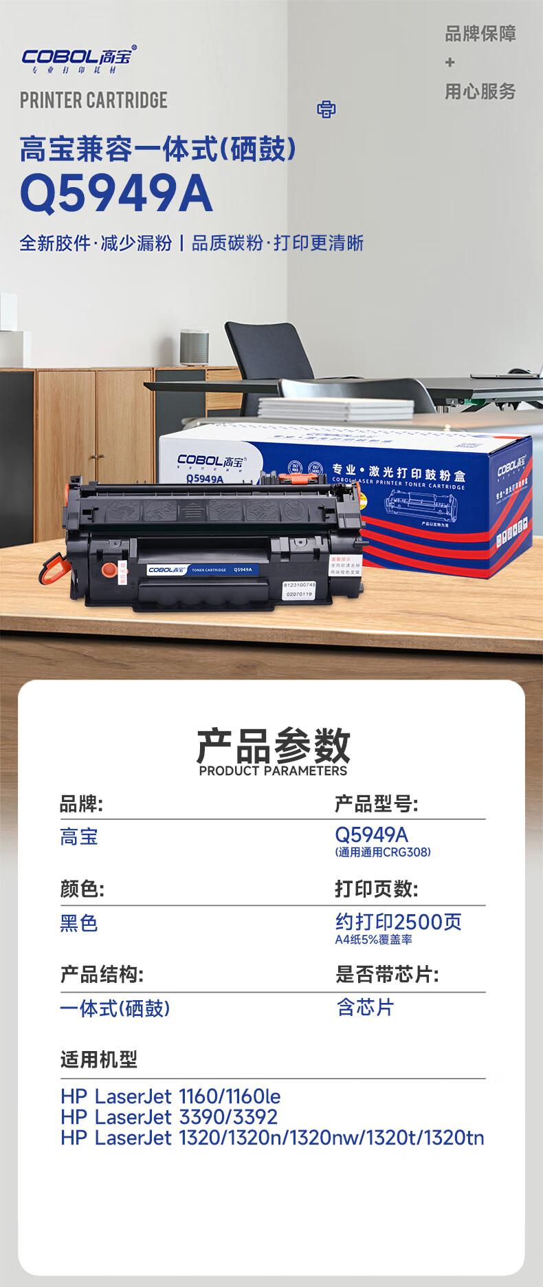 商品标题:高宝兼容Q5949A/CRG308硒鼓(鼓粉一体)黑色单个装打印量:2500页(个)