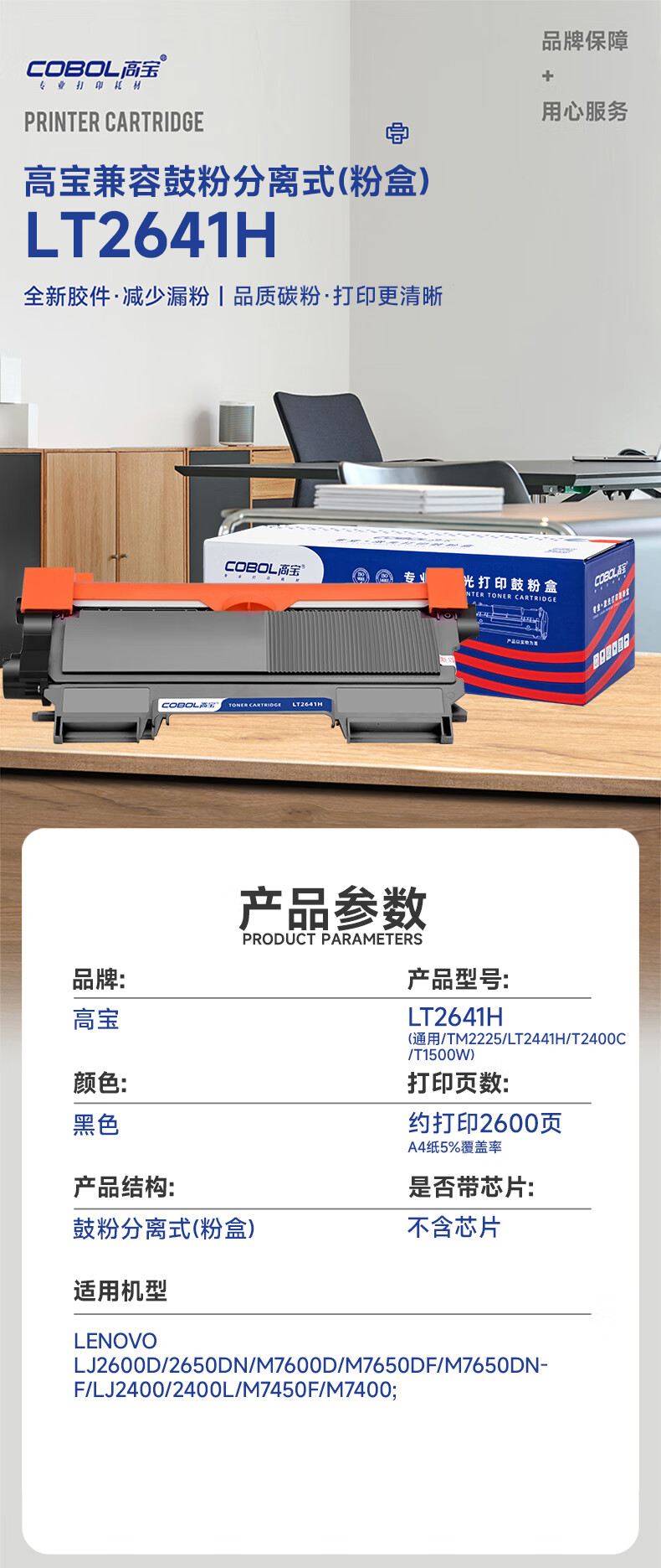 高宝(COBOL) 兼容LT2641H 硒鼓(鼓粉分离)黑色单支装(适用联想 LJ2600D/2650DN/M7600D/M7650DF/M7650DNF)打印页数:2600(单位:只)